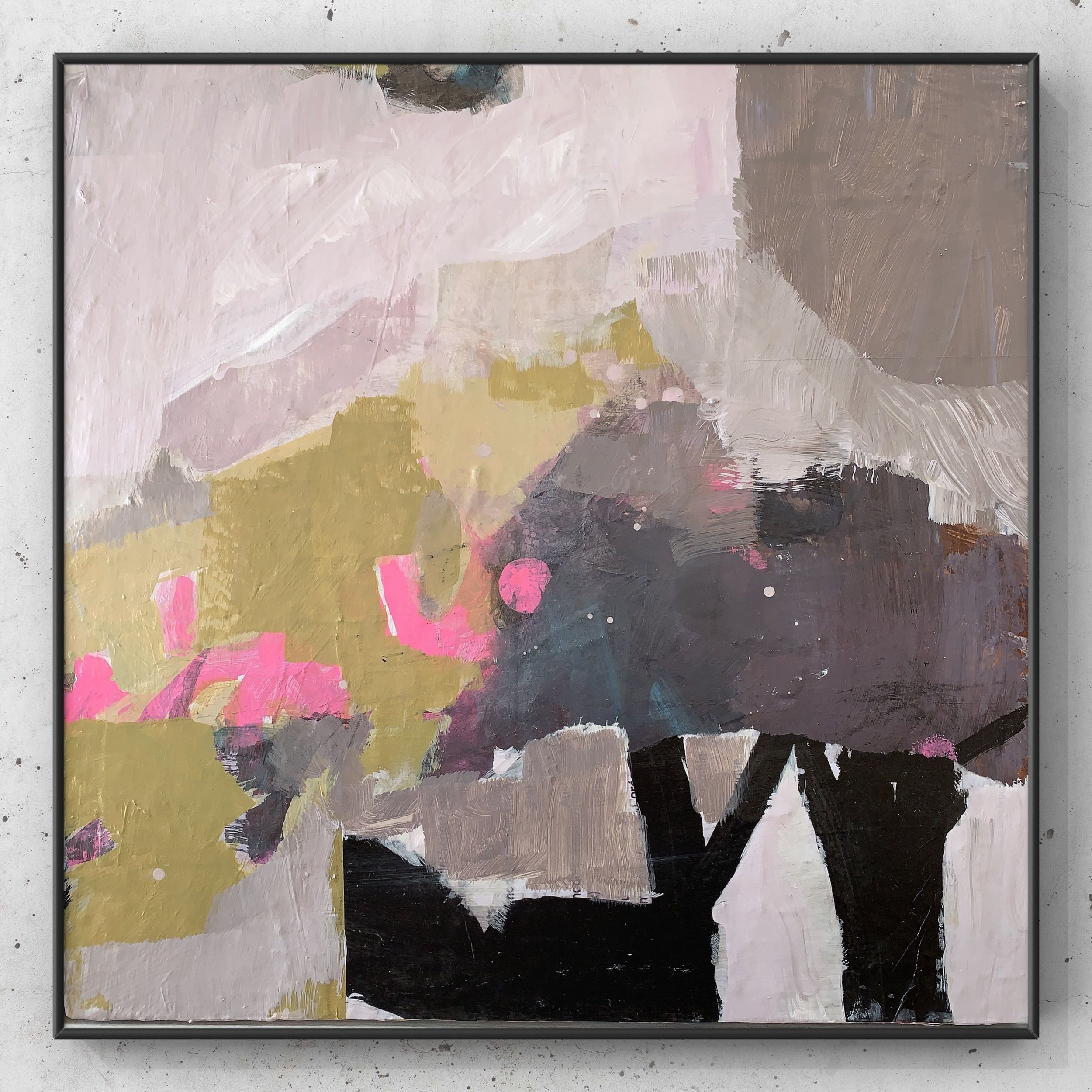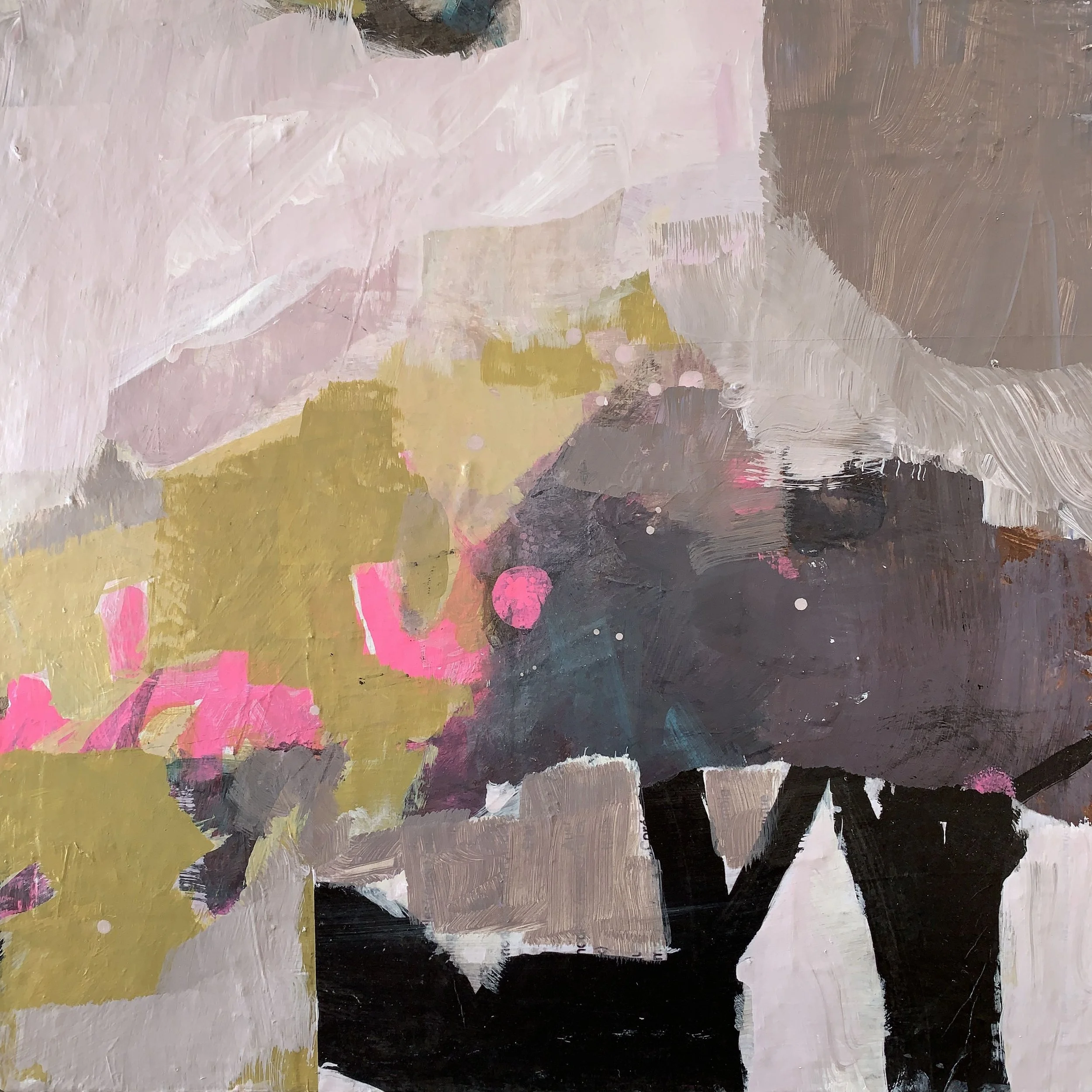 this little painting evokes a winter landscape in powdery tones. The tree trunks in the foreground create a strong contrast.